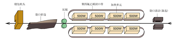 熱封縫合工作流程:袋口清潔(備選)→內(nèi)袋熱封(4組加熱塊加熱:聚四氟乙烯封口帶使加熱塊與袋子不直接接觸,以保護(hù)袋子外表不與加熱塊粘連)→壓輥壓合→袋口折邊→縫包機(jī):外袋縫紉